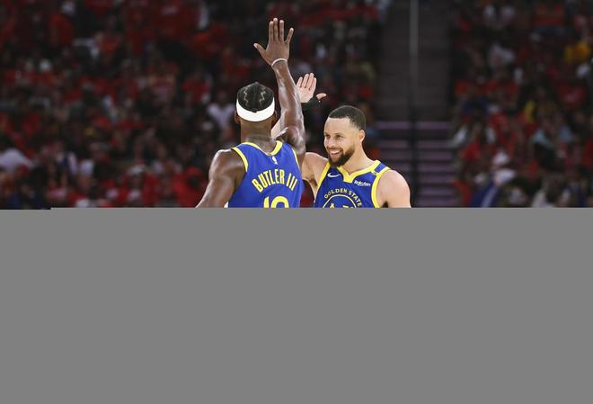 库里、巴特勒在场上庆祝